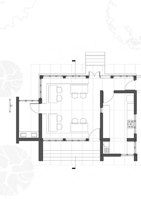 The structure was designed as a steel frame with a sloping roof, allowing it to be completed within a span of over three months. It sits on a raised plinth in response to water-logging on the site, besides allowing a better view to the river which remained hitherto hidden from view. The dining hall being flanked by cottages, solid walls along the shorter sides ensure sufficient privacy for its users while also framing beautiful views. To one end of the gable is a wash area inconspicuous in sight behind a mango tree at the entrance, while also muffling unpleasant sounds that typically frequent washrooms. To the other end is a kitchen that provides privacy from the neighbouring residence. A louvered opening at the top of the gable allows hot air to escape. Windows made of reclaimed wood lend an array of colours from the different species of wood used. Built-in seats utilize space efficiently, with handrails that double-up as backrests and armrests at a comfortable height. The architecture blends in seamlessly with its surroundings. Perhaps its real success is that the one who steps in to dine steps out with a smile.